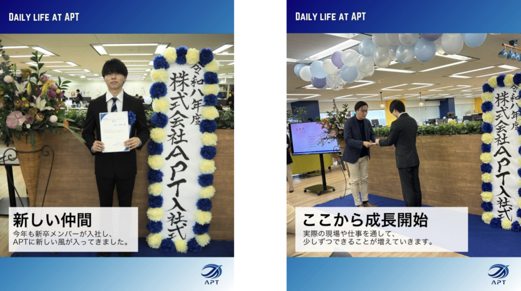 本年度、APTは志を共にする1名の新卒社員を迎えました。入社式を終え、現在は現場実務を深く理解するための「新卒採用研修」および、早期の活躍を支援する「オンボーディングプログラム」が本格的にスタートしています。 APTでは、過去数年間にわたり「一人ひとりと向き合い、次世代のリーダーを育てる」という方針のもと、あえて大人数ではなく厳選して1名〜数名の新卒採用を継続してきました。この徹底した少数精鋭の文化が組織の質を高め、現在では全従業員数約80名まで成長を遂げています。